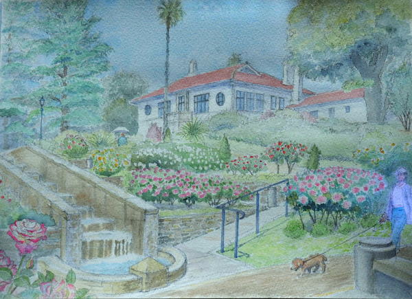その館が見えるバラの庭園