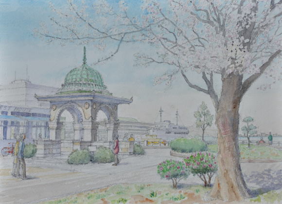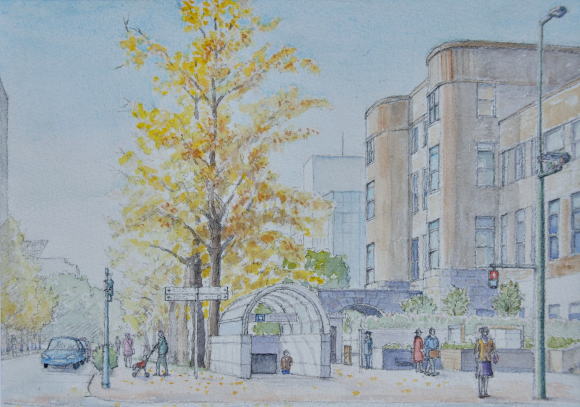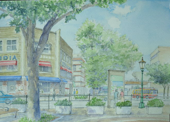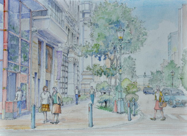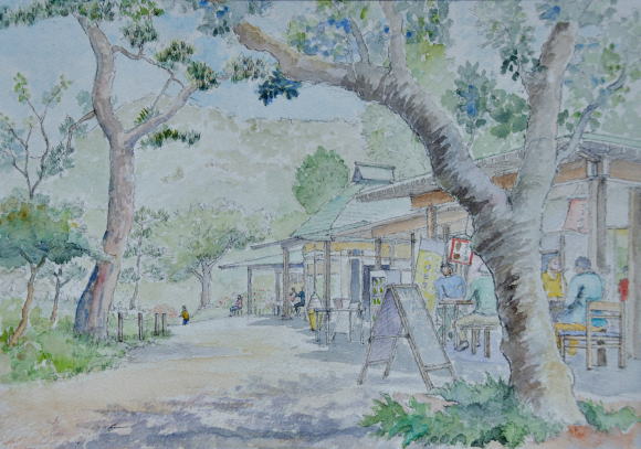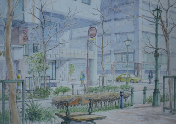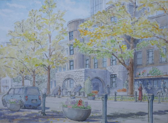 「木陰の休憩」 横浜美術館の前にある 並木道は夏の暑さをしのげる 木陰が心地よい休憩場所です 木々の間を風が吹き抜けます 絵の背後にマークイズの レストランは日傘の元に いつも多くの人がくつろいで います クリスマスの時期には この並木道はイルミネーション で輝きます。 |
