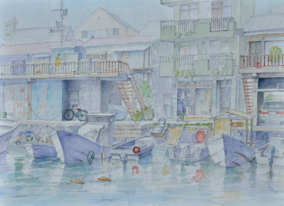 昼時の船溜まり 子安の船着き場 中には朽ちた船が水の中に 半分船体を沈めています。 |