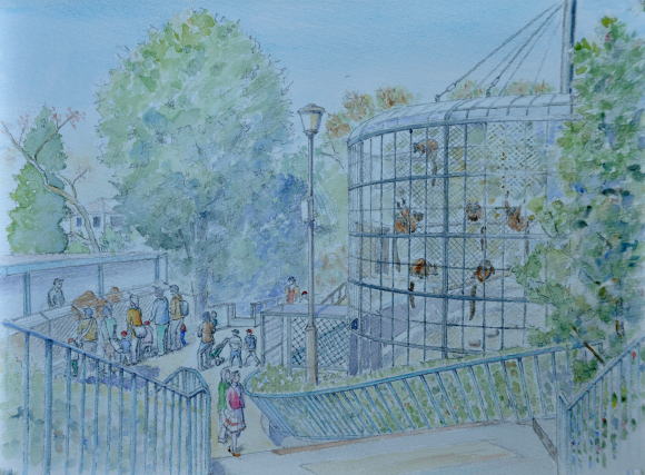 檻の中と外 横浜の中心部近い野毛山動物園 小さくても多くの動物を見ることが できます。しっぽが長い赤狐サルの 檻の向かいに、世界最高齢の ラクダ・ツガルさんの檻があり、 人気が高かったのですが、 描いた翌年亡くなりました スケッチの時も老体を押して 立ち上がり子供たちに 向き合っていました。 猿とラクダは檻の中から 見物客をどう見ていたのでしょうか |