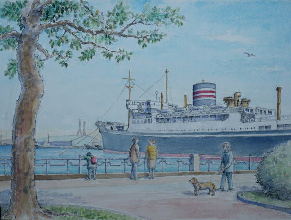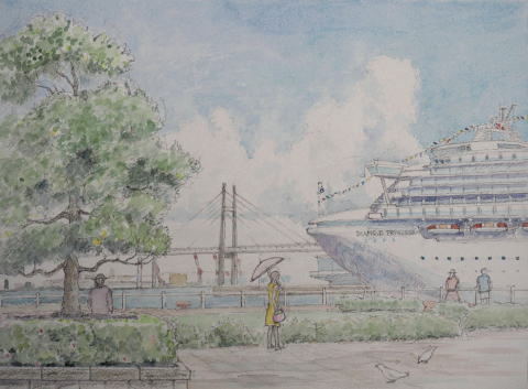 夏の港 赤レンガ倉庫の庭 から大桟橋に停泊する クルーズ船を望む (2年後にこのダイヤモンド・ プリンセス号でショッキングな ことが起きるとは、長く記憶に 刻まれるでしょうか) 遠くにベイブリッジが |