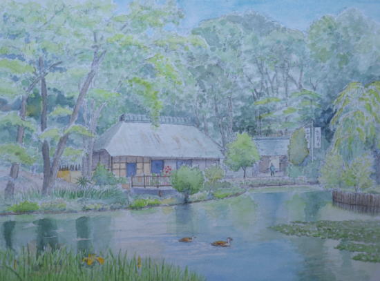 緑に囲まれて せせらぎ公園 池の向こうに古民家 背後の森に包まれて 細長い公園内を 細い流れが続き この池に注がれる 5月ごろにはスイレン の筏が繁茂して カモたちが泳ぐ サギが池の端に じっと獲物を狙い |
