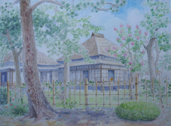 盛夏の別邸 伊藤博文の海の別邸 金沢八景の海に浮かぶ 野島公園。当時は、 のどかな美しい海景が 広がっていたのでしょう 茅葺の瀟洒な建物 百日紅の花が咲く |