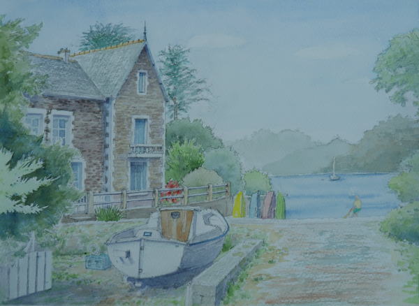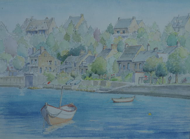 ”川岸の眺め” St.Sliac 大西洋の河口からかなり遡った 場所にあるサン・シュリアック 河の桟橋に立って、ポツンと浮かぶ ボートと丘の斜面に並ぶ石造りの 古民家群を眺めながら |