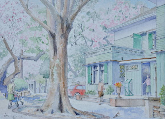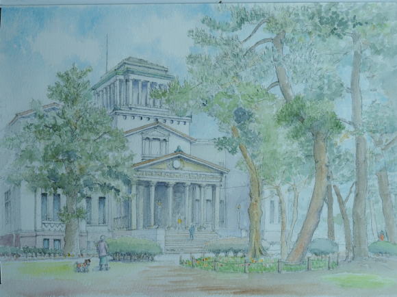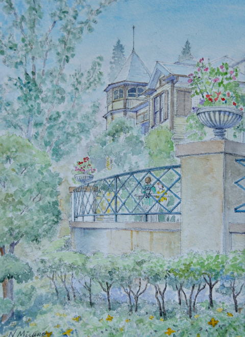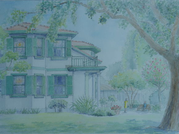 横浜・山手 イタリア山 イタリア領事館がおかれた 幾何学的様式の庭園に 正面から描くのが定番ですが 敢えて斜めから、喫茶コーナー のテラス越しに見える洋館を 試してみました |