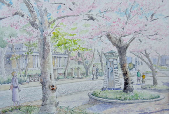 桜の通り 山手通りに並木の桜が咲く頃 華やかな気分になります 通りの向こうにブラフ234番館 白いレトロな電話ボックスは 現役です |