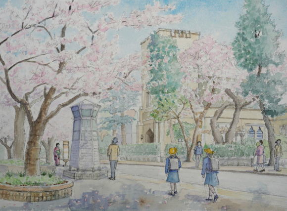 山手の教会が木の後ろに その姿をのぞかせています 帰り道の小学生も桜を見ながら |