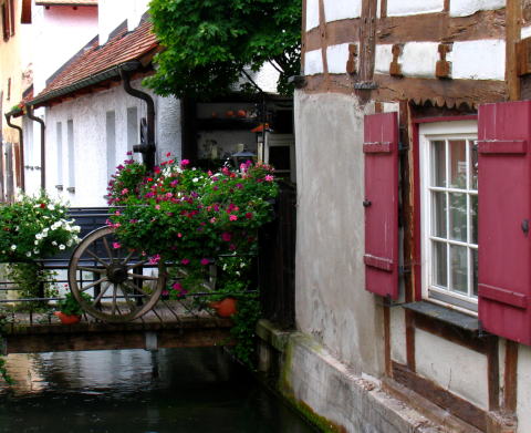 | 黒い森にある温泉地に宿泊し散策 | 川沿いの民家入り口・小橋の飾り が目を引く |
