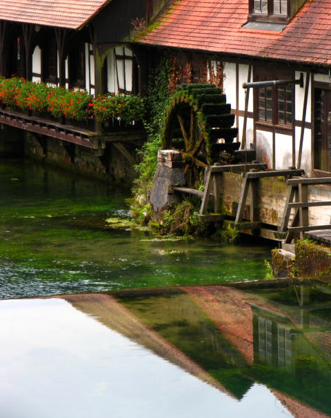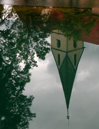 | 修道院の塔が川面に映る | ドナウ川の水源の一つと言われる場所 Donaueschingen |