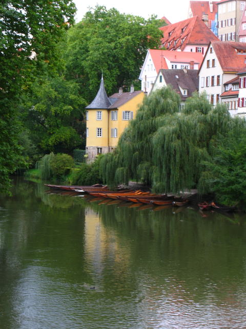 | テュービンゲン 川辺に建つ詩人(ヘルダーリン)の家、とんがり屋根 | 川沿いの水車小屋 赤い屋根が映り込み |