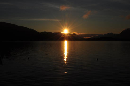 | 静寂の湖の向こうから登る朝日 | ||