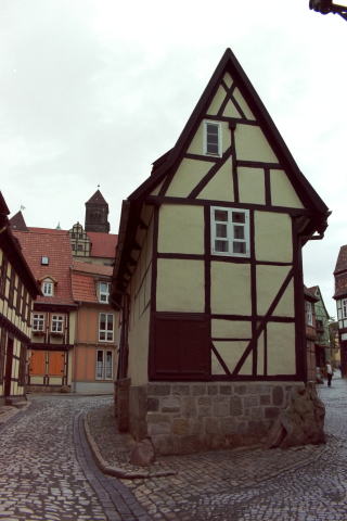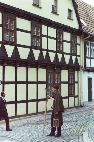 | 道の真ん中にポツンと佇む一軒家 | 突然現れた昔の衣装を着てランタンを手に下げた夜警 (街のガイドさんらしい) |
