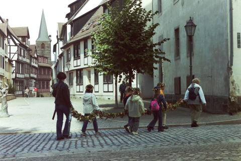 | 右側:ツタで覆われた重厚な市庁舎 | 幼稚園の帰り? |