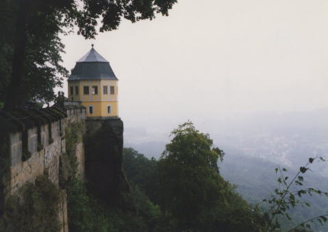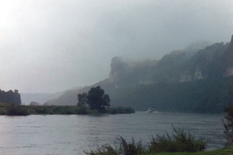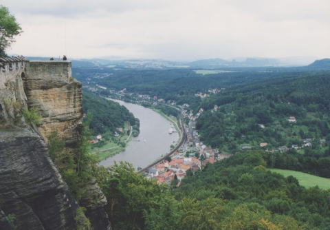 | 眼下でU字のカーブを描く川 対岸の台地に百合の石Liliensteinと 呼ばれる刑務所が見える。(マイセンの陶工やアナーキストなどを収容) |