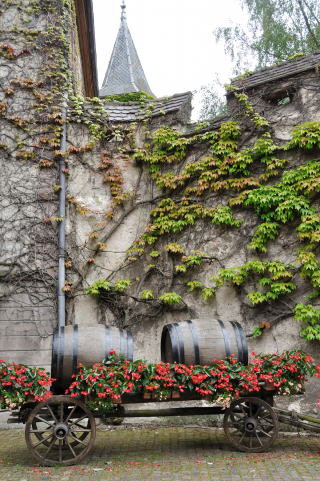 | 木組みの大きな建物 古びた手押し車に盛り付けた花 |