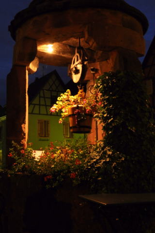 | 村の中心広場に使われなくなった古井戸 花を飾って周りにレストランの椅子 右は夜の井戸 この広場の反対側に教会が見える |