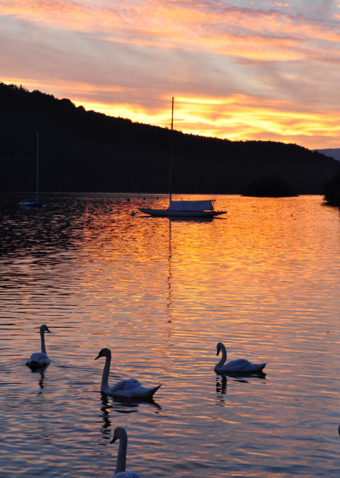 | 夕暮れ時、湖の中で遊んでいた白鳥たちが港の近くに集まってきた 対岸の陸地が闇の中に沈み、ヨットのシルエットを湖面に映える 夕焼けの色の中に影を落としていた。静まり返った湖畔で時間を忘れるひととき |