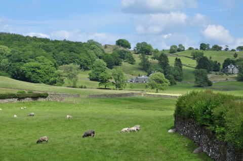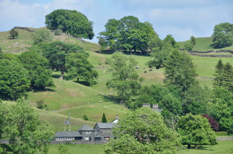 | 広々とした牧草地にのんびりと羊が散らばる | ビアトリクス・ポターが過ごした家の前からの眺め | |