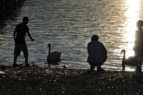 | 湖畔で白鳥と遊ぶ人たち | ||