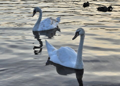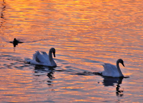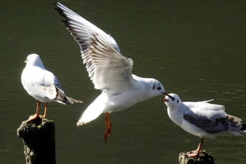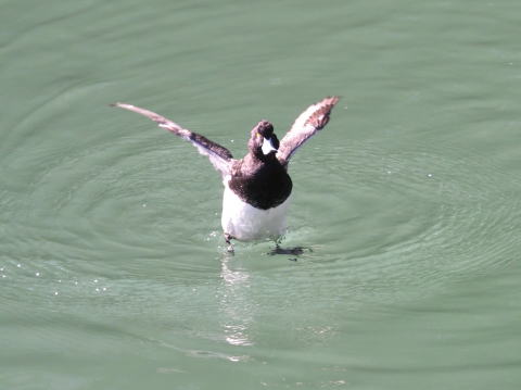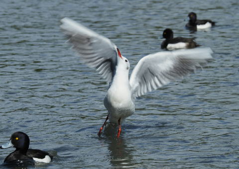 | 冬になると大群で川に陣取るキンクロハジロ、オスのデモンストレーションが目を惹く | ||||