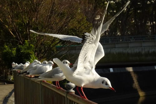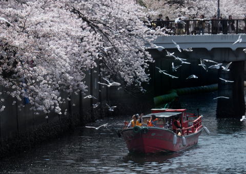 | 桜の並木を眺めて航行する遊覧船を追いかける白い群れ | ||||