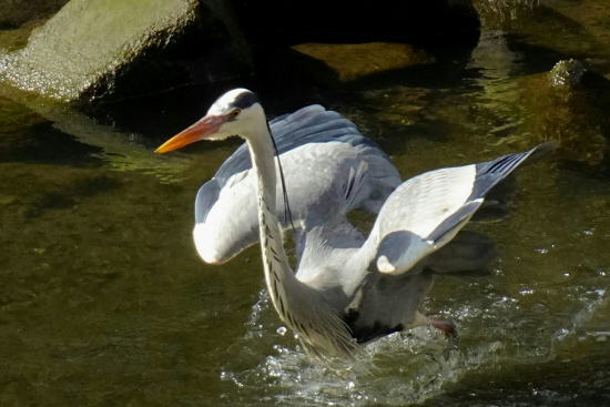 | 獲物を見つけ駆け寄るアオサギ | ||