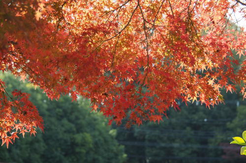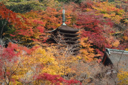 | 談山神社 は山の上 色づいた木々の中に塔が覗く |