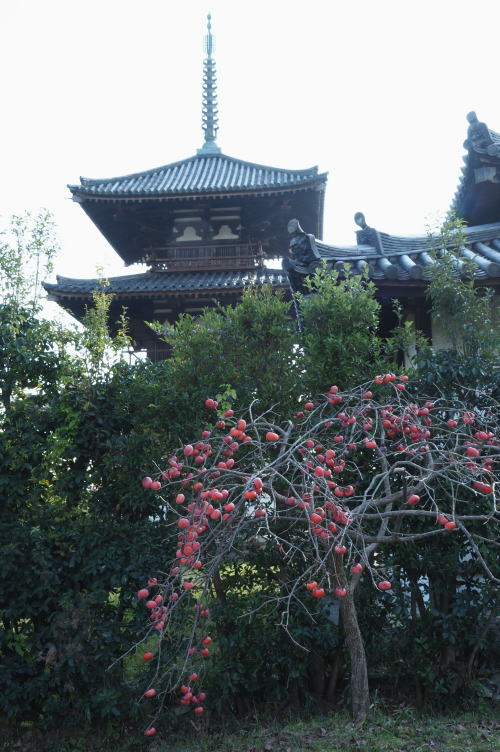 | 法隆寺 | 法起寺 バス便の都合が悪く法隆寺から歩いて。 たわわになった柿がお寺の塔と何故か よく似合う。秋の風情を味わいました。 この柿の木の手前にコスモスの群落が また絵になる光景 |
