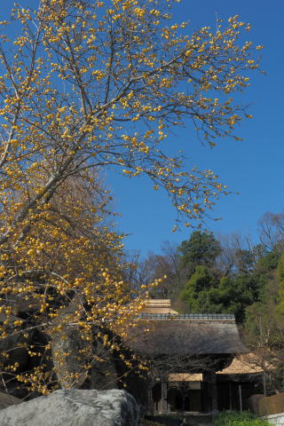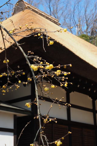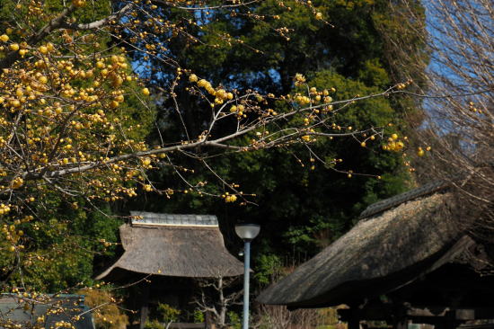 参道の脇にある大きな ロウバイの樹に黄色い 花が見事に咲く。 本堂の屋根が 新しく茅で 葺かれていました。 |