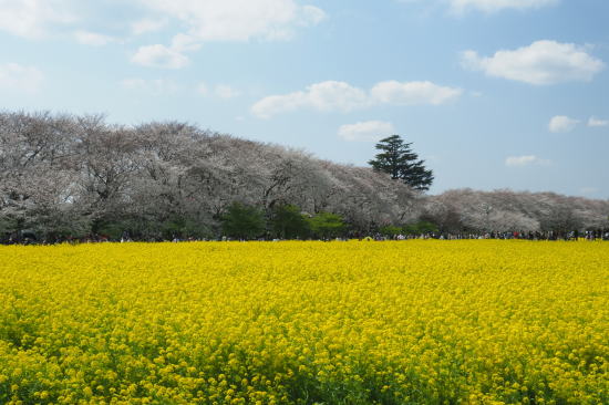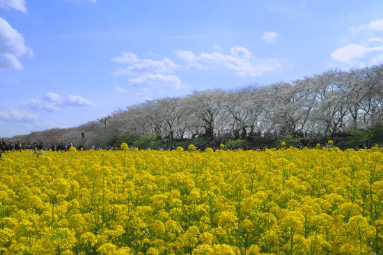 堤に沿って 桜並木が続く 黄色いじゅうたん 菜の花が 一面に広がる |
