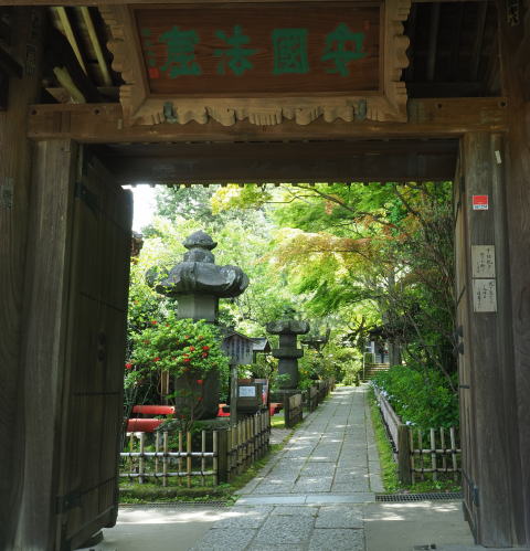 安国論寺 鎌倉駅からバスで 逗子方面へ 深緑に包まれた 山門をくぐる |
