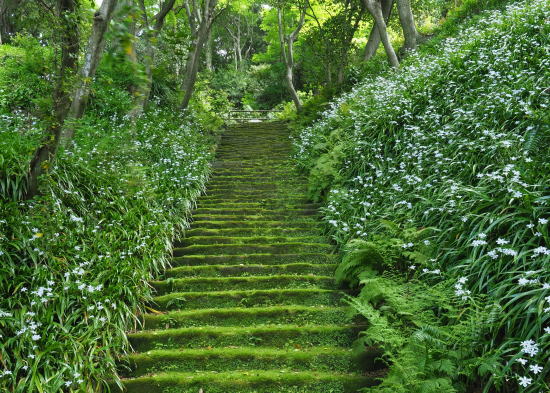 妙法寺 入口を入って 折れ曲がった道を進むと 山門が見えてくる 山門から先に 苔むした階段が 続く 階段の両側に 密集した見事な シャガの群生 殆ど人がいない 境内で 心静かに この風景に浸る |