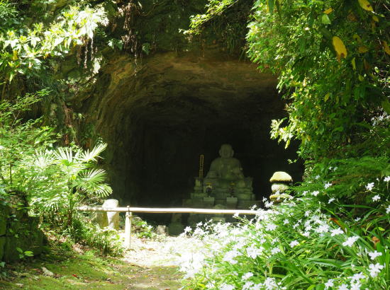 祠の中に 仏様が鎮座 鬱蒼とした緑が 祠に覆いかぶさ鵜 |