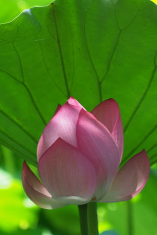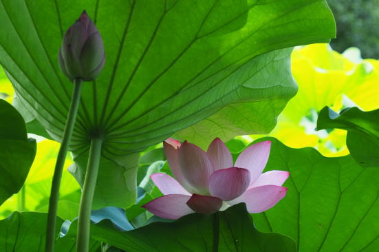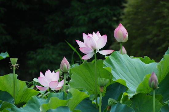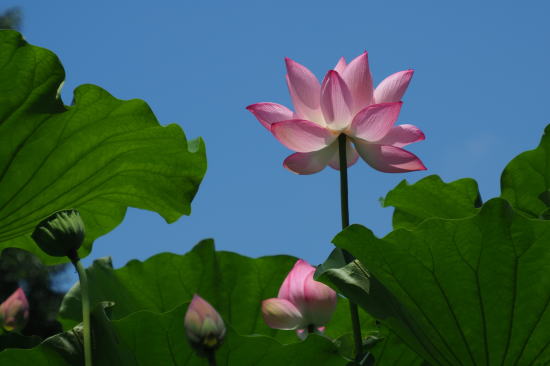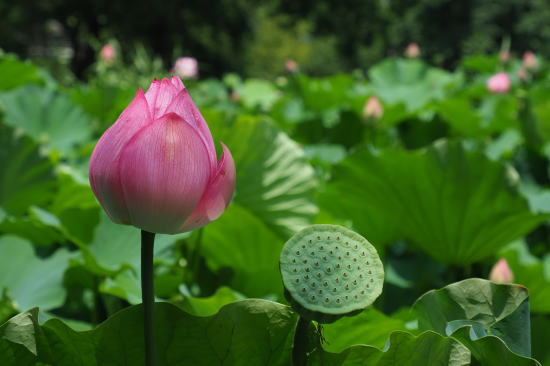 真夏、連日猛暑日がテレビで話題になっている頃、大賀・古代ハスを見ようと 行田のハス田、千葉の公園などを調べていたら、町田の薬師池公園に古代ハスが 咲いているとネットで見つけました。大きなハスの葉が茂り、花が見つけられません。 葉の裏に咲きかけた濃いピンクの花が葉影を頼りに見られました。 やはり、ハスの花は早朝ですね。