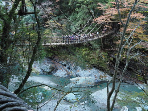 | 曽谷のつり橋 (足元の丸木に隙間が大きくスリルがある) | 大歩危の流れ 大雨の折には谷一杯に雨水が溢れるらしい |