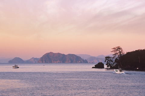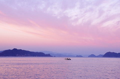 | 早朝 出航する漁船 | 萩・朝焼けの海 漁船が穏やかな海で漁をする |