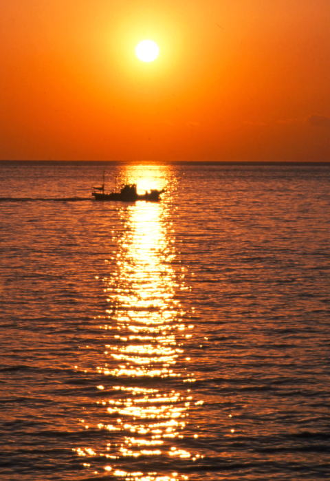 | 西伊豆から望む富士 | 土肥の夕日 帰りの船が海にできた光の道をゆっくりと横切っていく |