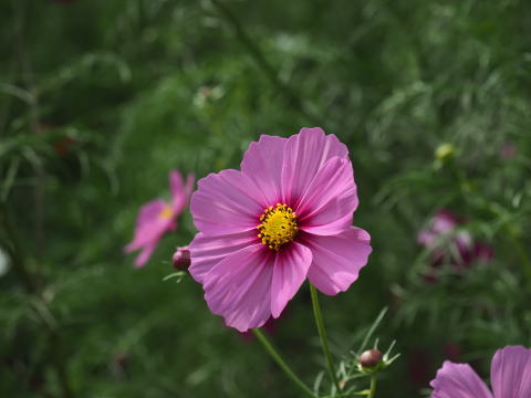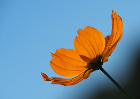 青く晴れ渡った空に向かって、長い茎を風にゆらしながら咲くコスモスの花はかれんで美しい。