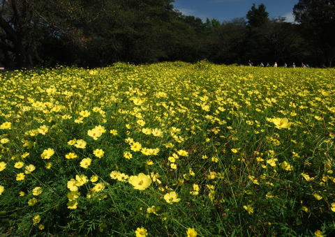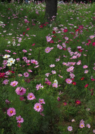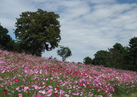 広い丘の斜面一杯にいろんな色のコスモスの花が咲き競うさまは晴れやかで心を和ませます。