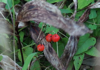 | 道端で見つけたホトトギス | 葉が枯れた下にスズランの赤い実 | |