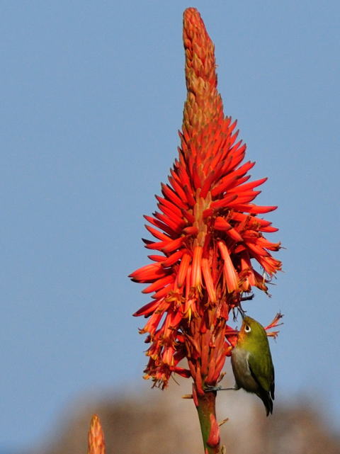 爪木崎の丘に咲くアロエの花にメジロが 花の蜜を求めて飛び回っている |