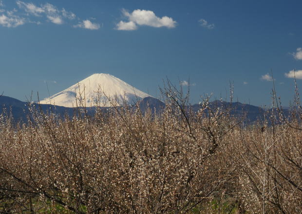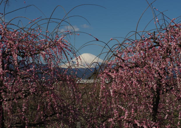 | 紅梅の樹間に望む富士山 | 白梅林越しに残雪の富士を望む |